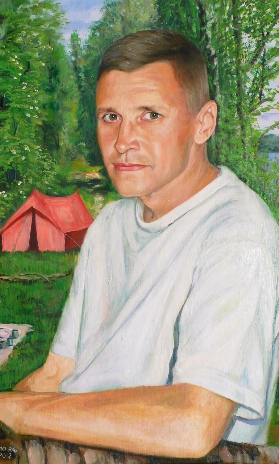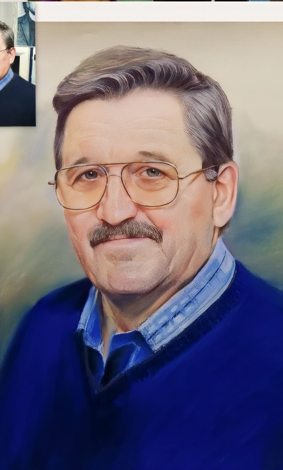 Портрет по фото в реалистичной манере, визуально напоминающий фотографию; выполняется масляными красками по акварельной бумаге и оформляется под стекло.