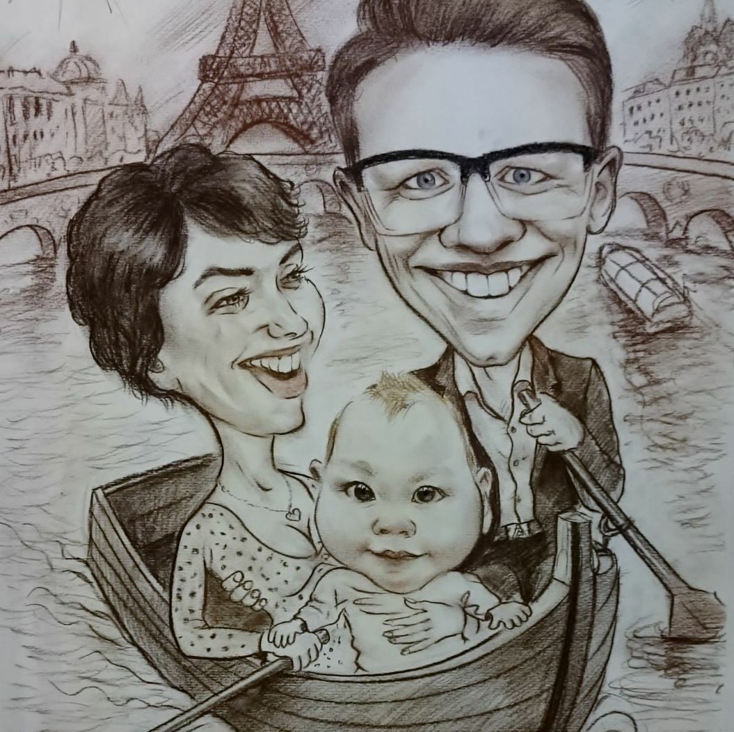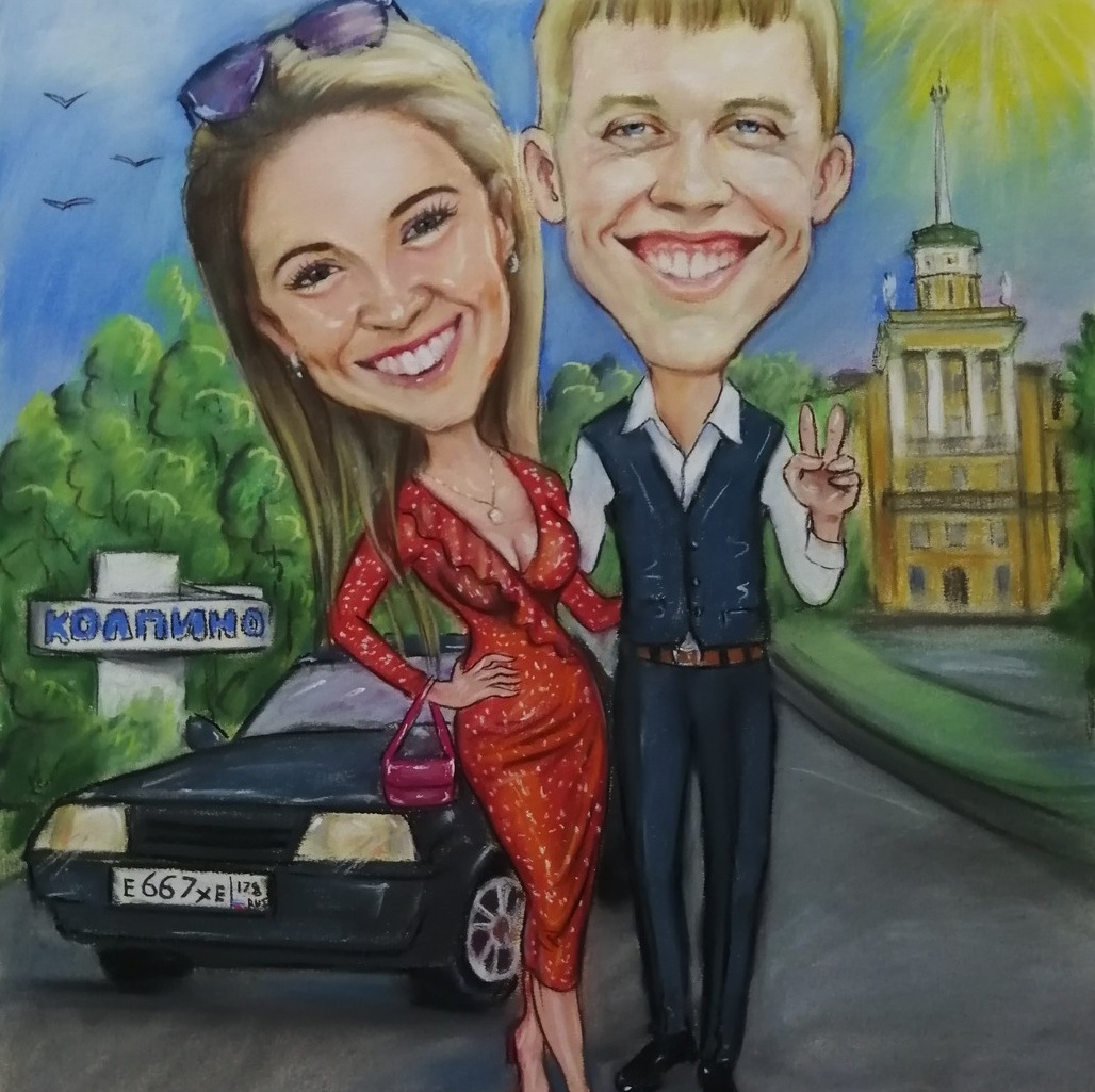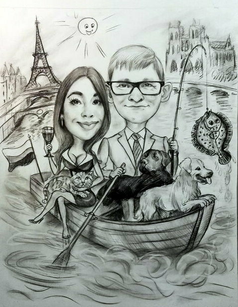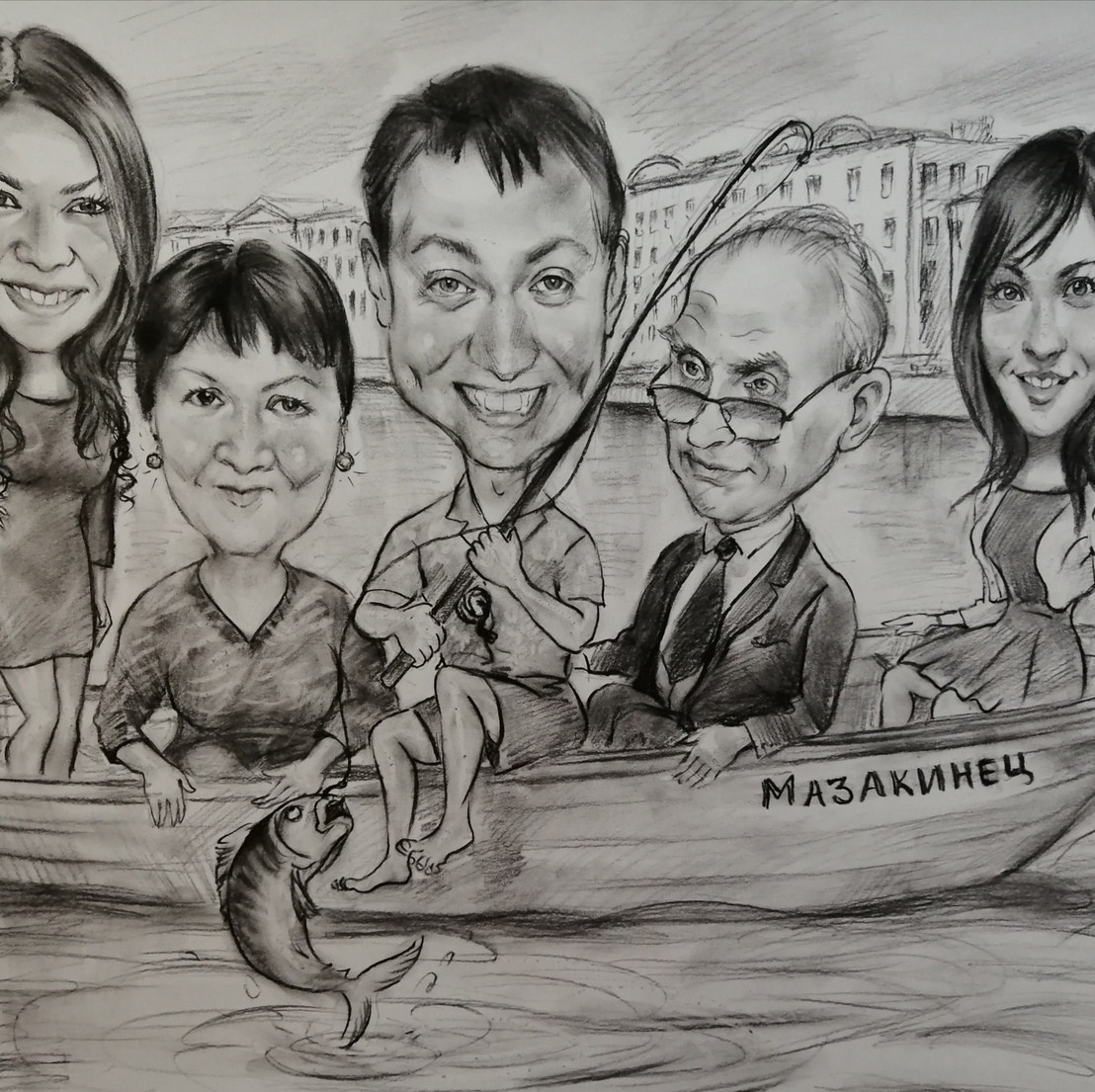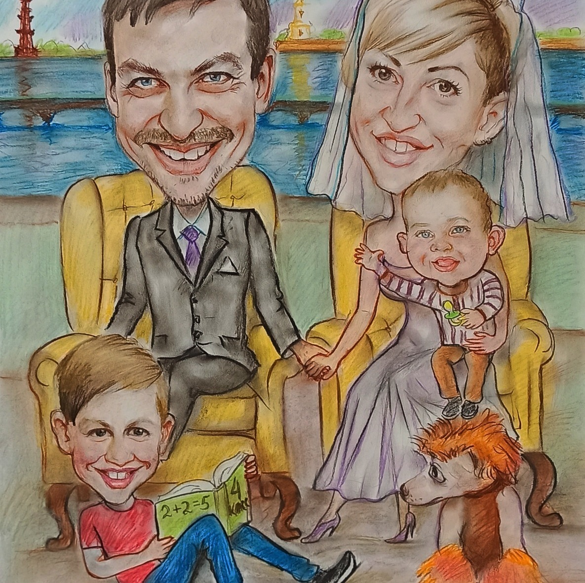 Работа создаётся по фото хорошего качества: чем лучше видны лицо, мимика и детали, тем точнее получится результат. Можно сделать шарж одного человека, пары или целой компании, а также объединить людей с разных фотографий в одну композицию. При желании добавляем сюжет: любимое хобби, профессию, интересные детали, фон или предметы — чтобы шарж выглядел персонально и «про вас».