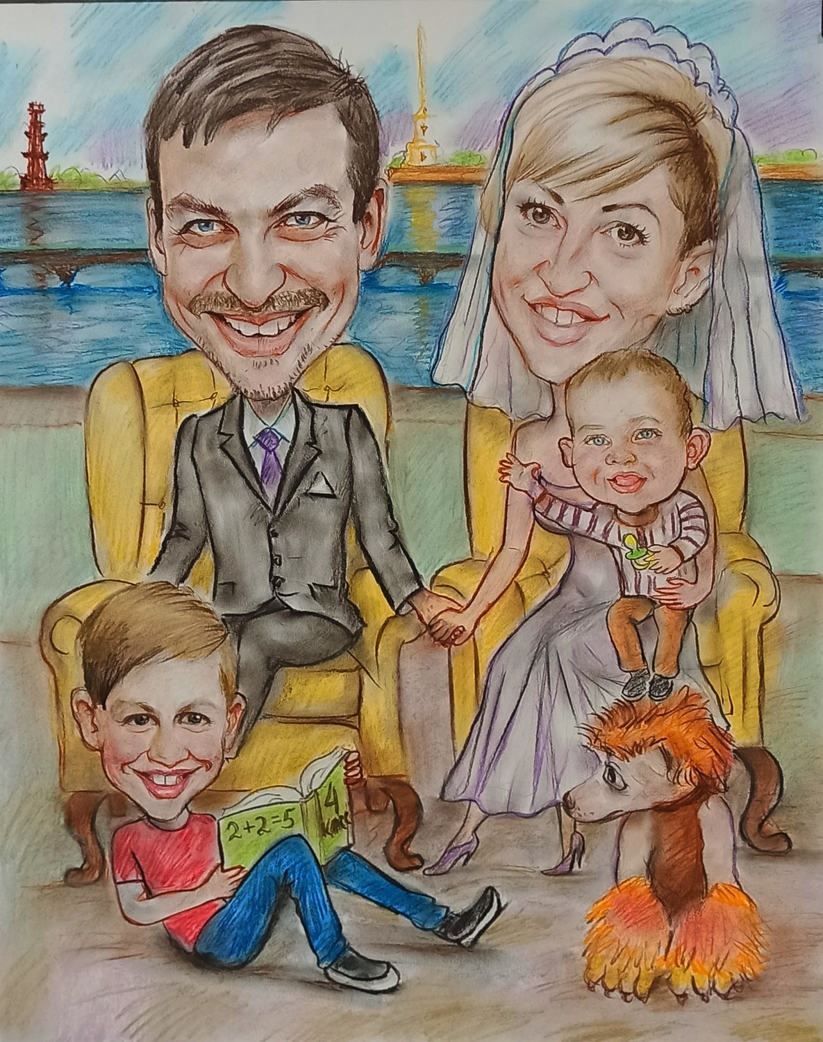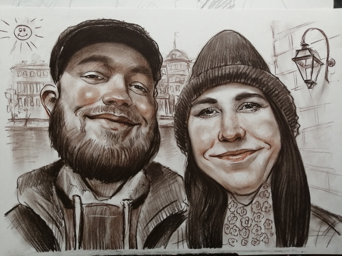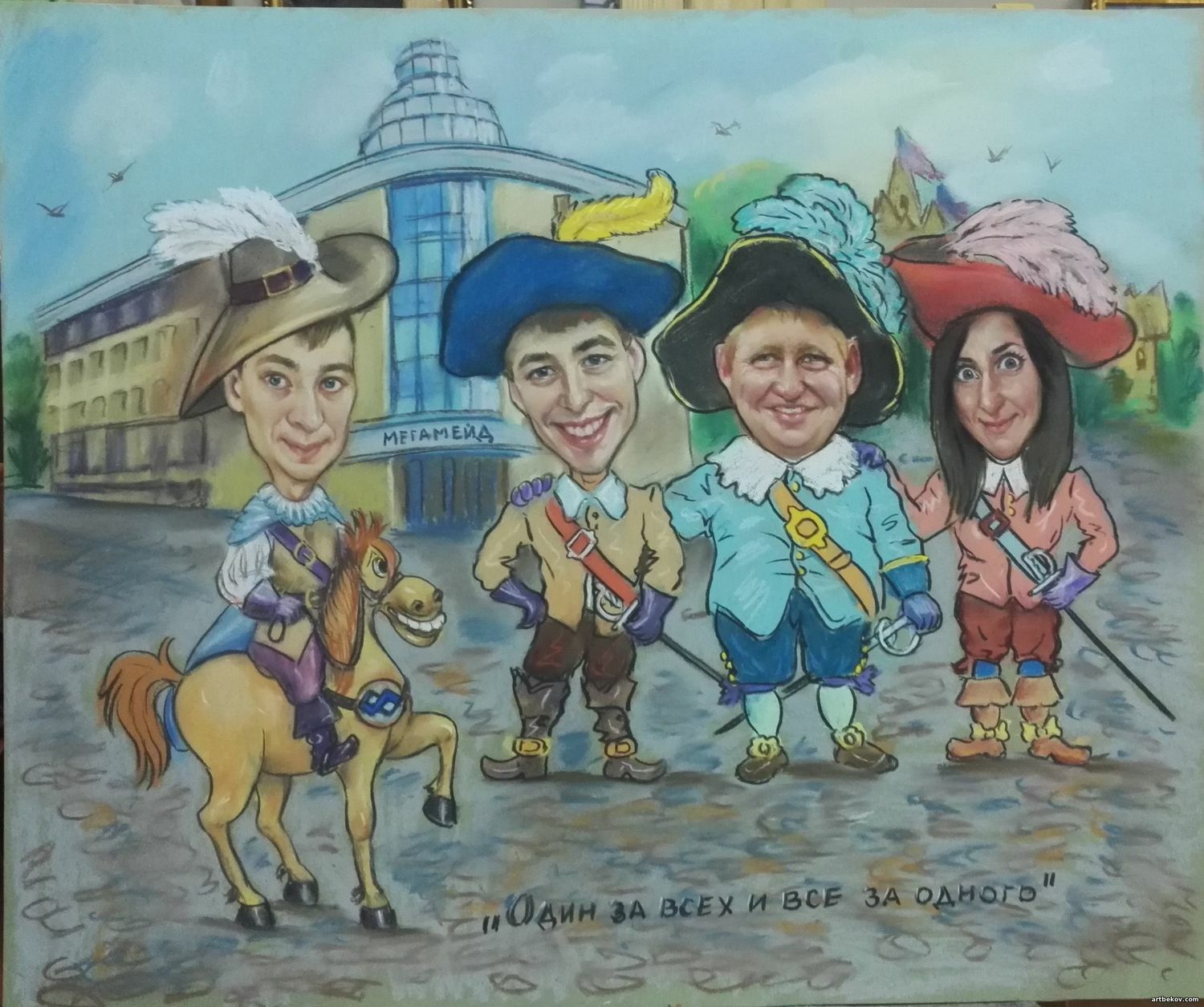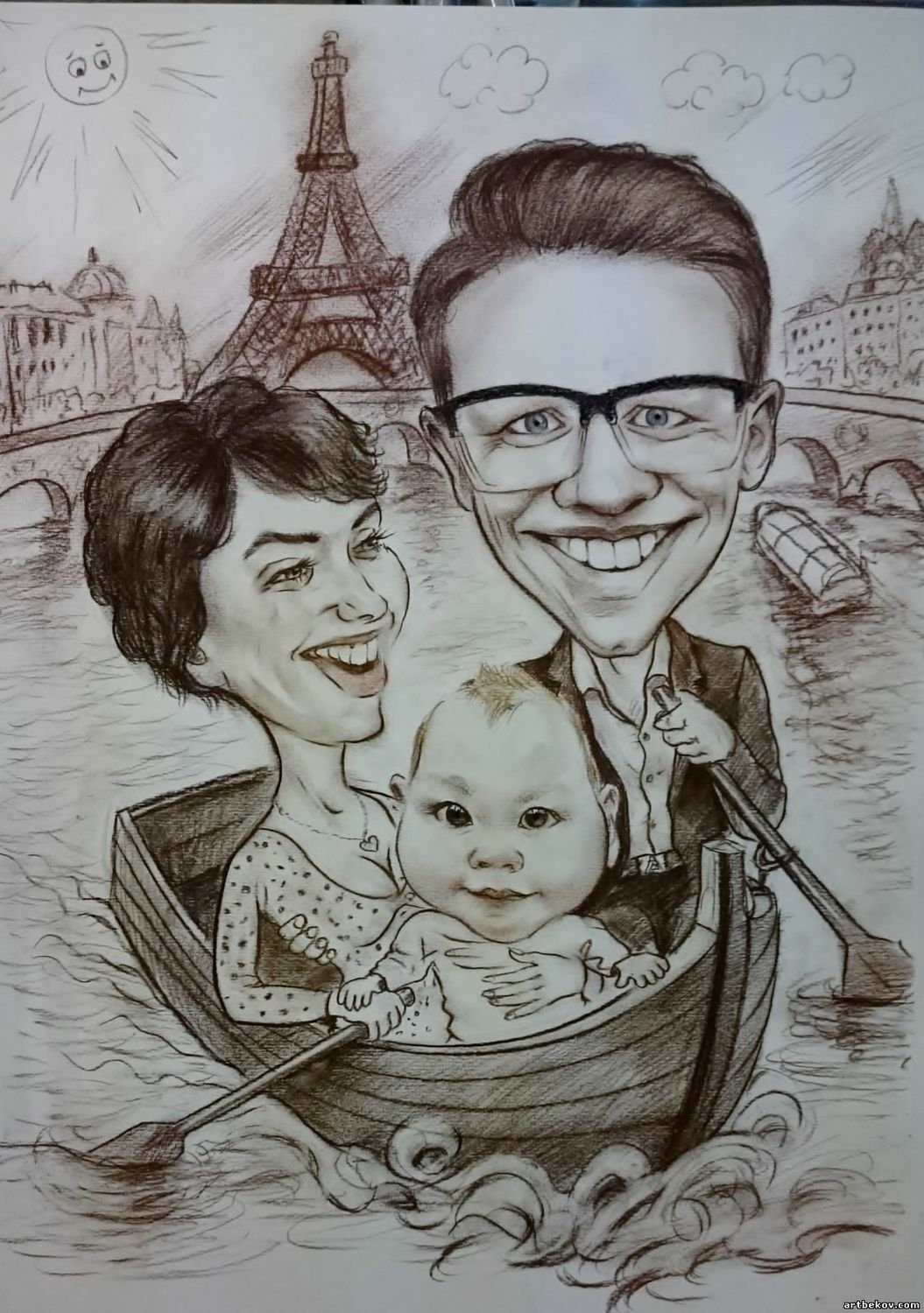 Работа создаётся по фото хорошего качества: чем лучше видны лицо, мимика и детали, тем точнее получится результат. Можно сделать шарж одного человека, пары или целой компании, а также объединить людей с разных фотографий в одну композицию. При желании добавляем сюжет: любимое хобби, профессию, интересные детали, фон или предметы — чтобы шарж выглядел персонально и «про вас».
